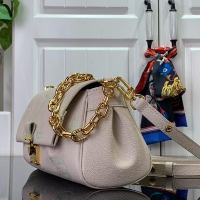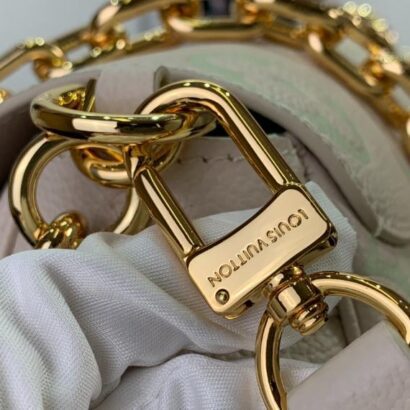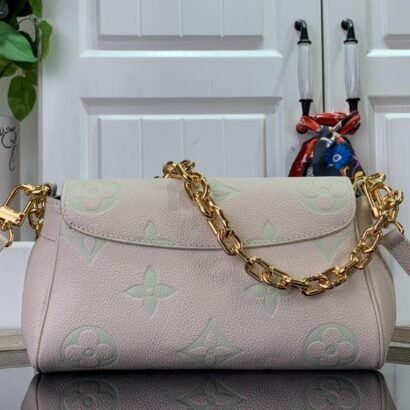 LV Favorite Bicolor Monogram Leather Handbag is fashioned from grained leather with a Giant Monogram motif. The soft pastel colorway, combined with the pleats, brings a couture feel. The removable strap adjusts for short-shoulder carry or cross-body wear while the gold-color chain, also removable, is perfect for use.
