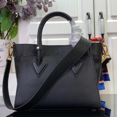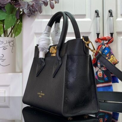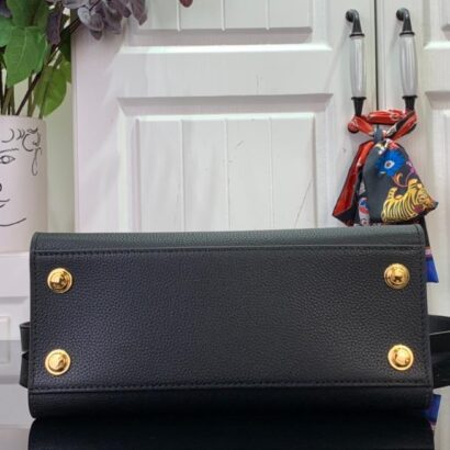 The LV On My Side PM Leather Handbag is made from calf leather, with perforated calf leather on the gusseted sides. The elegant colorway is livened up with a gold-color twist closure and gold-color buckles on the removable strap.